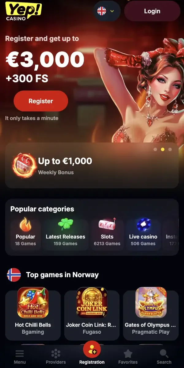 VÄr Yep-app er tilgjengelig pÄ iOS og Android, sÄ du kan velge oppsettet som passer enheten og innstillingene dine. NÄr den er installert, kan du bruke samme konto for casino og sport, og du kan bytte mellom spill uten ekstra nedlastinger. FÞr ditt fÞrste uttak pÄ Yep Casino kan vi be om KYC-dokumenter som pass eller nasjonalt ID-kort, adressebevis og dokumentasjon pÄ midlenes opprinnelse ved stÞrre innskudd.
